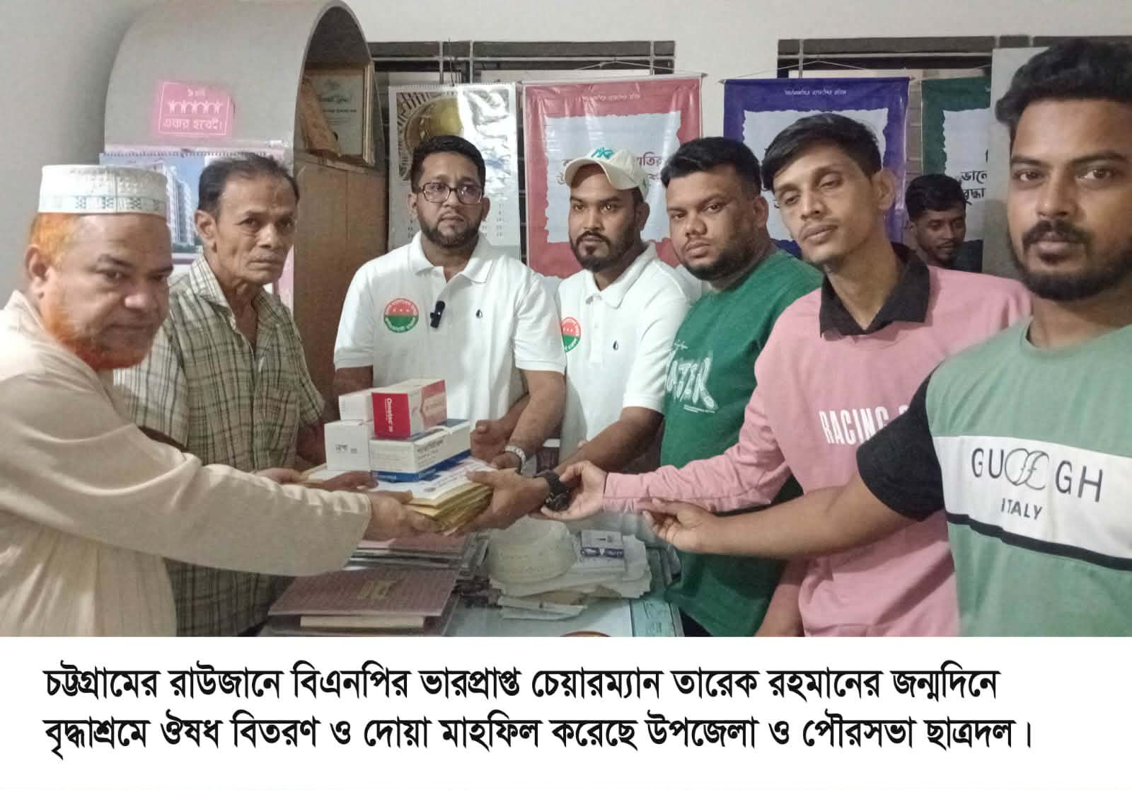 বিএনপি’র ভারপ্রাপ্ত চেয়ারম্যান তারেক রহমানের জন্মদিনে দক্ষিণ রাউজানে খতমে কোরআন, দোয়া মাহফিল ও ওষুধ বিতরণ করেছে। গত বৃহস্পতিবার (২০ নভেম্বর) নোয়াপাড়া ইউনিয়নের আমেনা বশর বয়স্ক পূর্ণবাসন কেন্দ্রে আশ্রিত প্রবীণ নারী-পুরুষের মাঝে এস ওষুধ বিতরণ করা হয়। এ কর্মসূচি আয়োজন করে চট্টগ্রাম উত্তর জেলা ছাত্রদলের সাবেক যুগ্ম সম্পাদক সাইফুল আজম ছোটনের নেতৃত্বে।